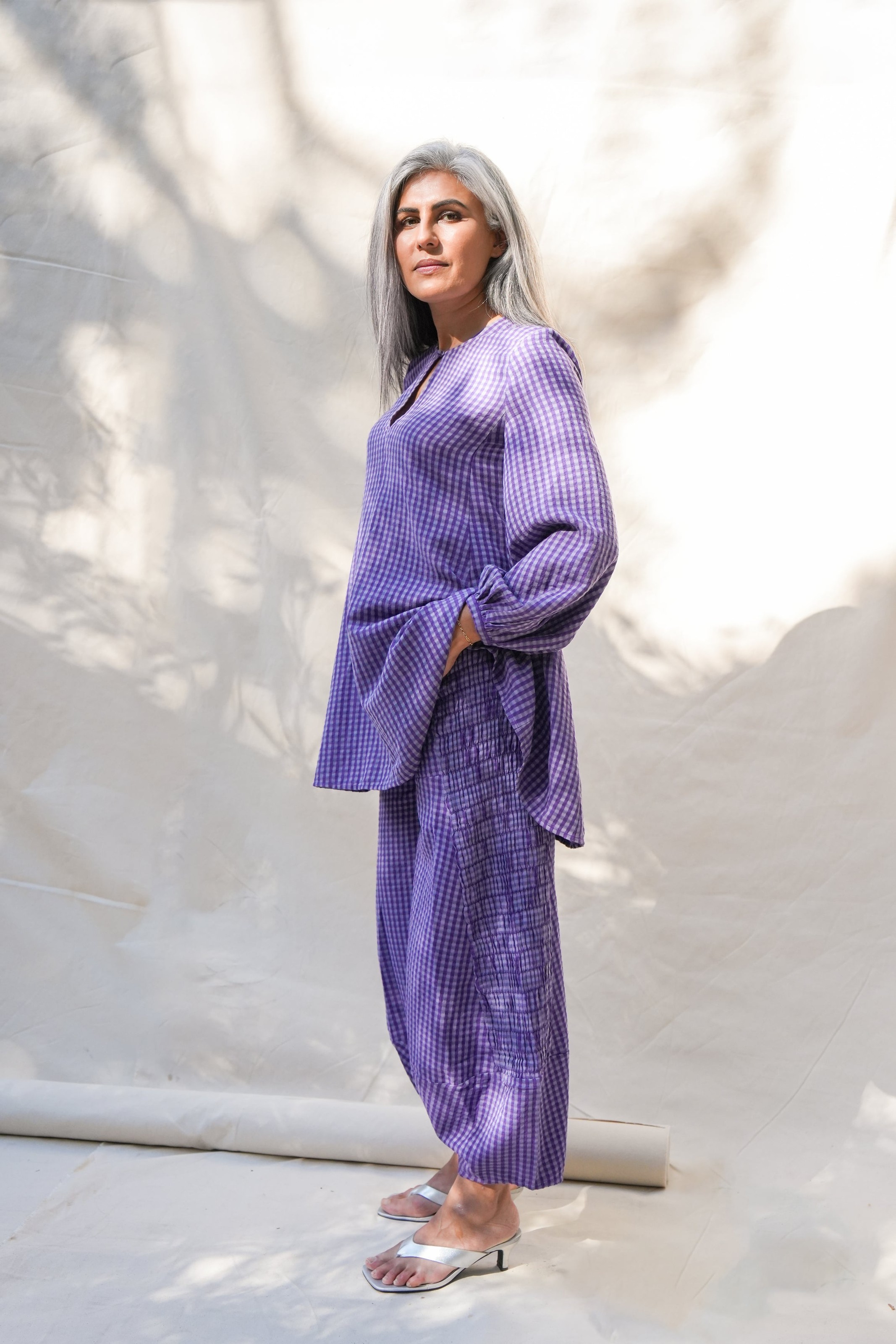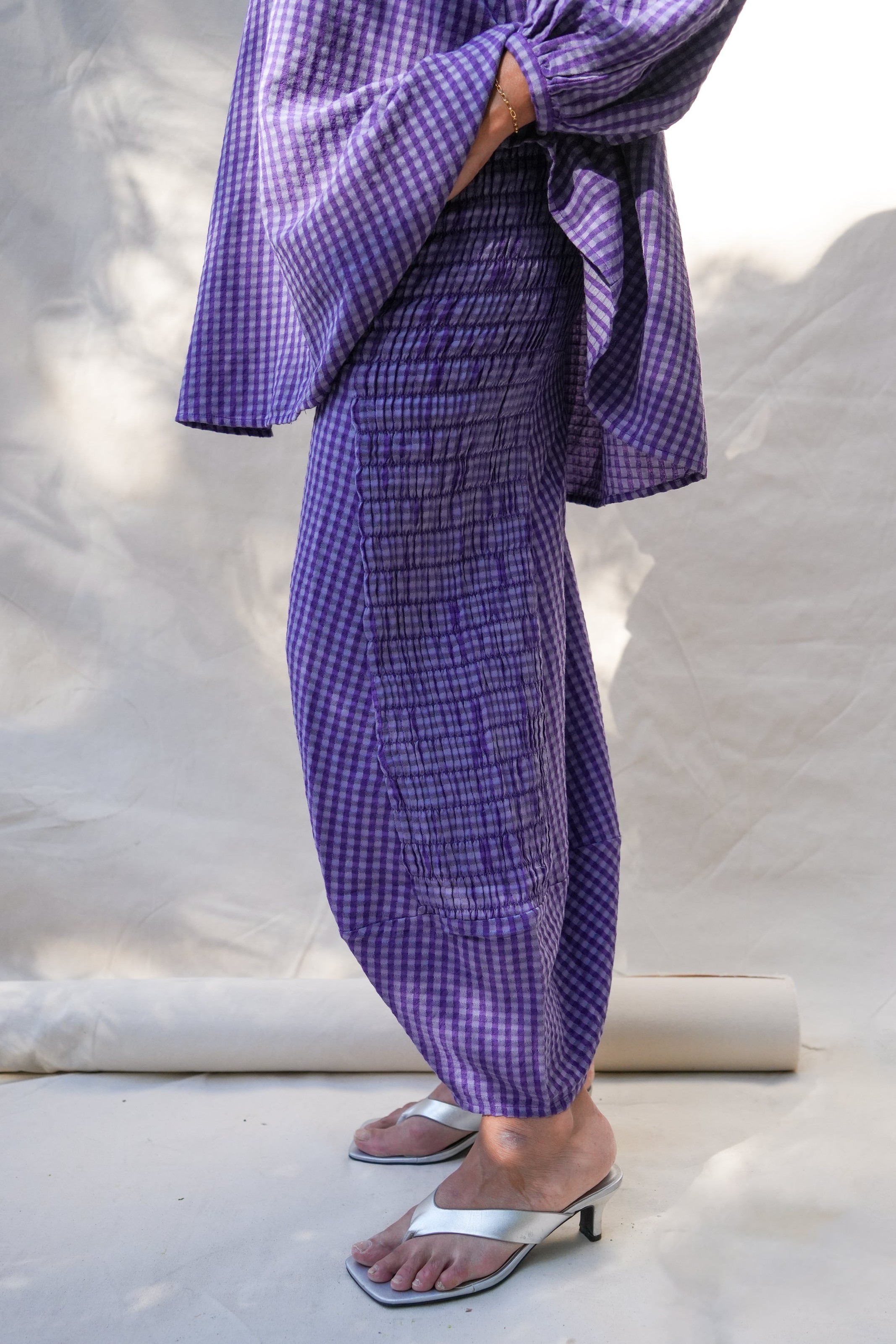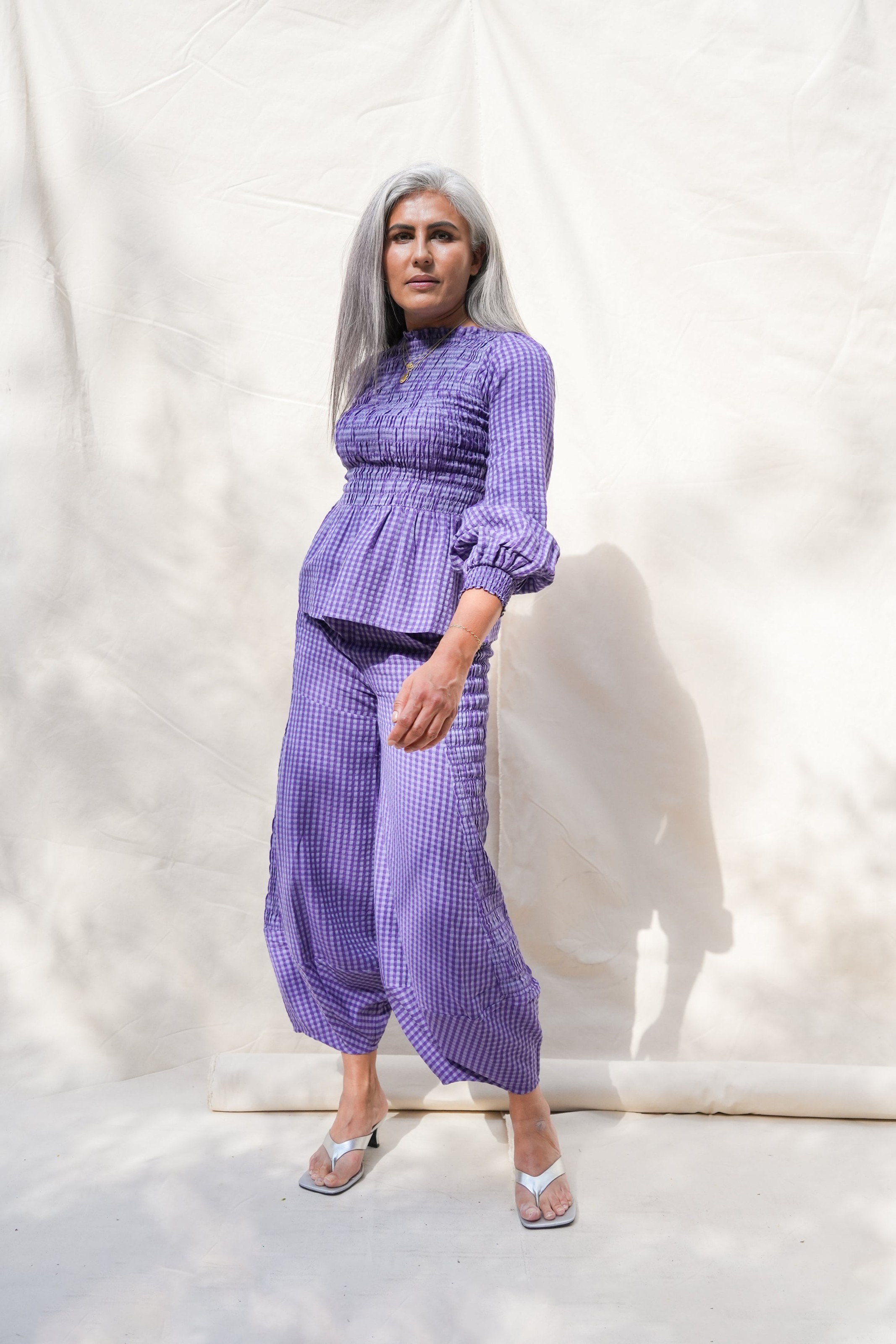 Our signature dhoti-inspired barrel pants return for fall in a cozy wool-blend gingham, custom-woven in Punjab, India. Featuring elasticized smocking panels and a drawstring waist, these pull-on pants offer ease, volume, and texture—perfect with a simple tee or styled as a full set with the Leonora Dress. Made in our favorite seasonal color: Butterfly Purple.