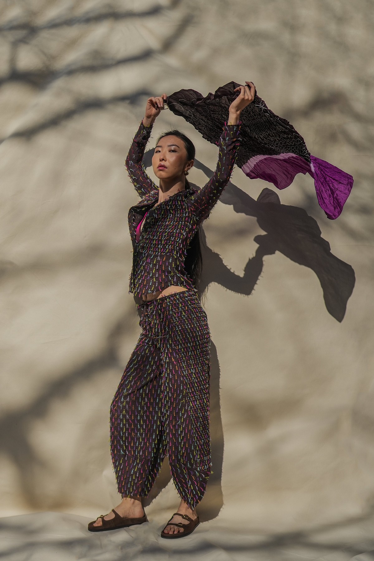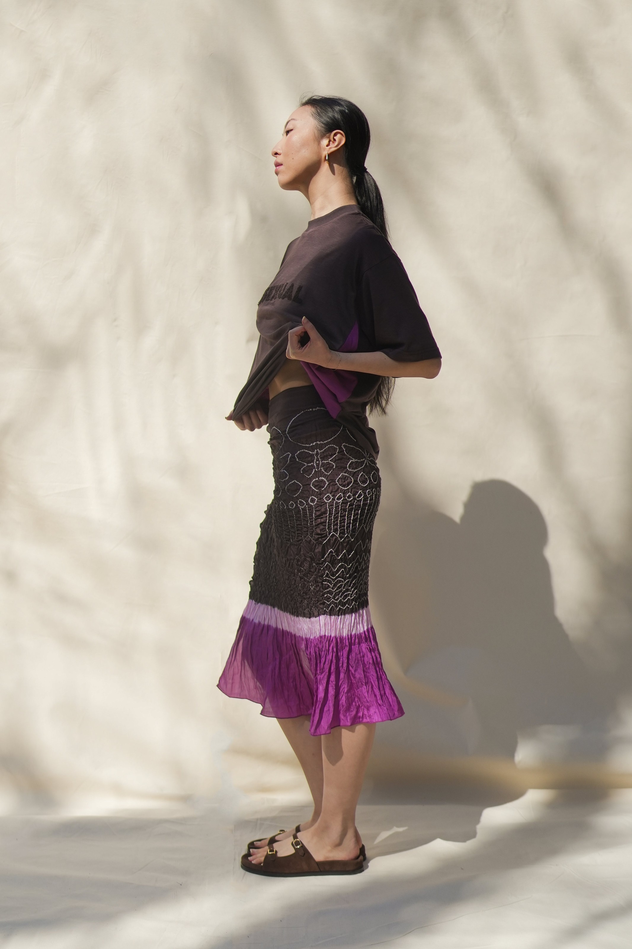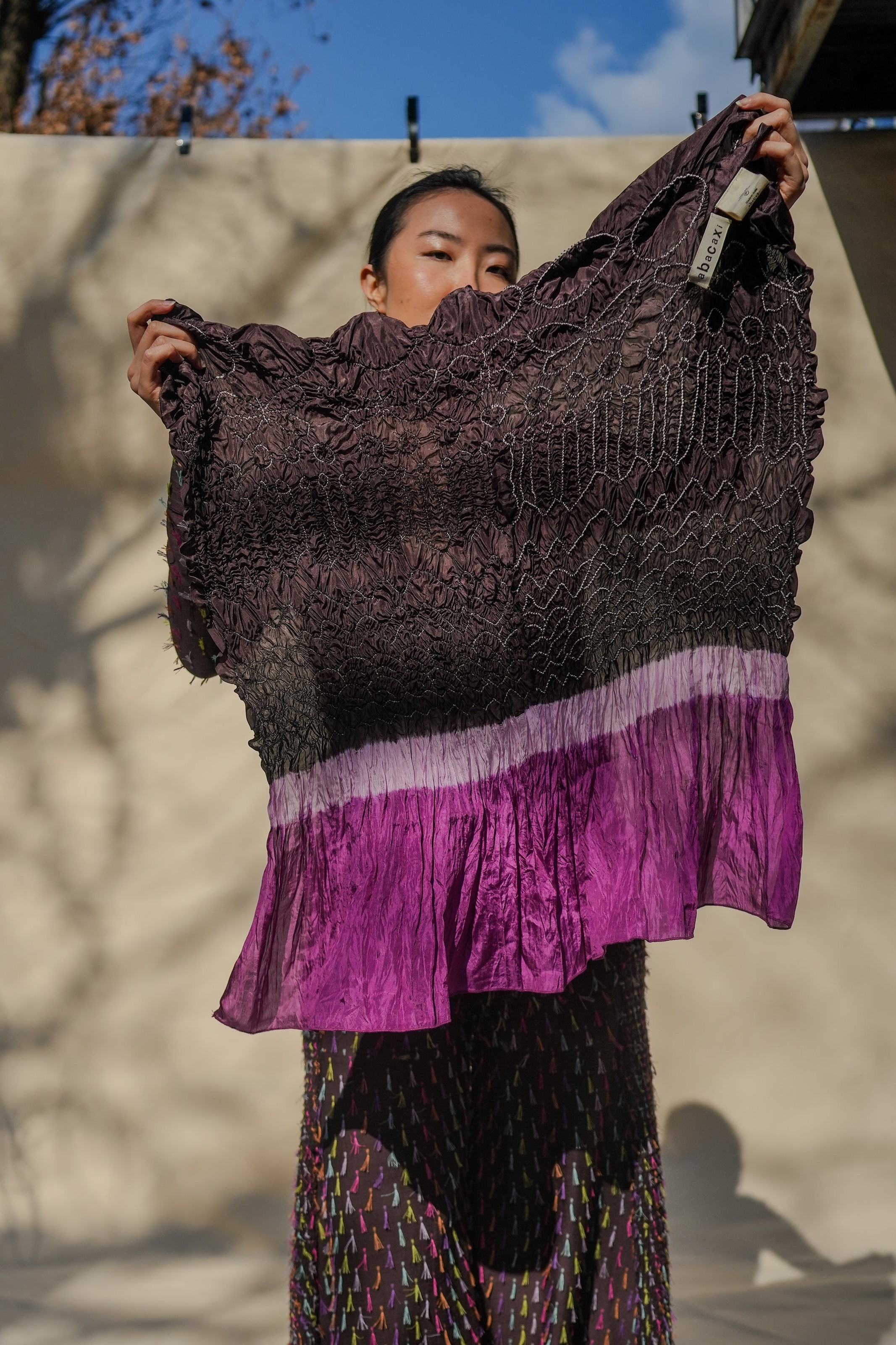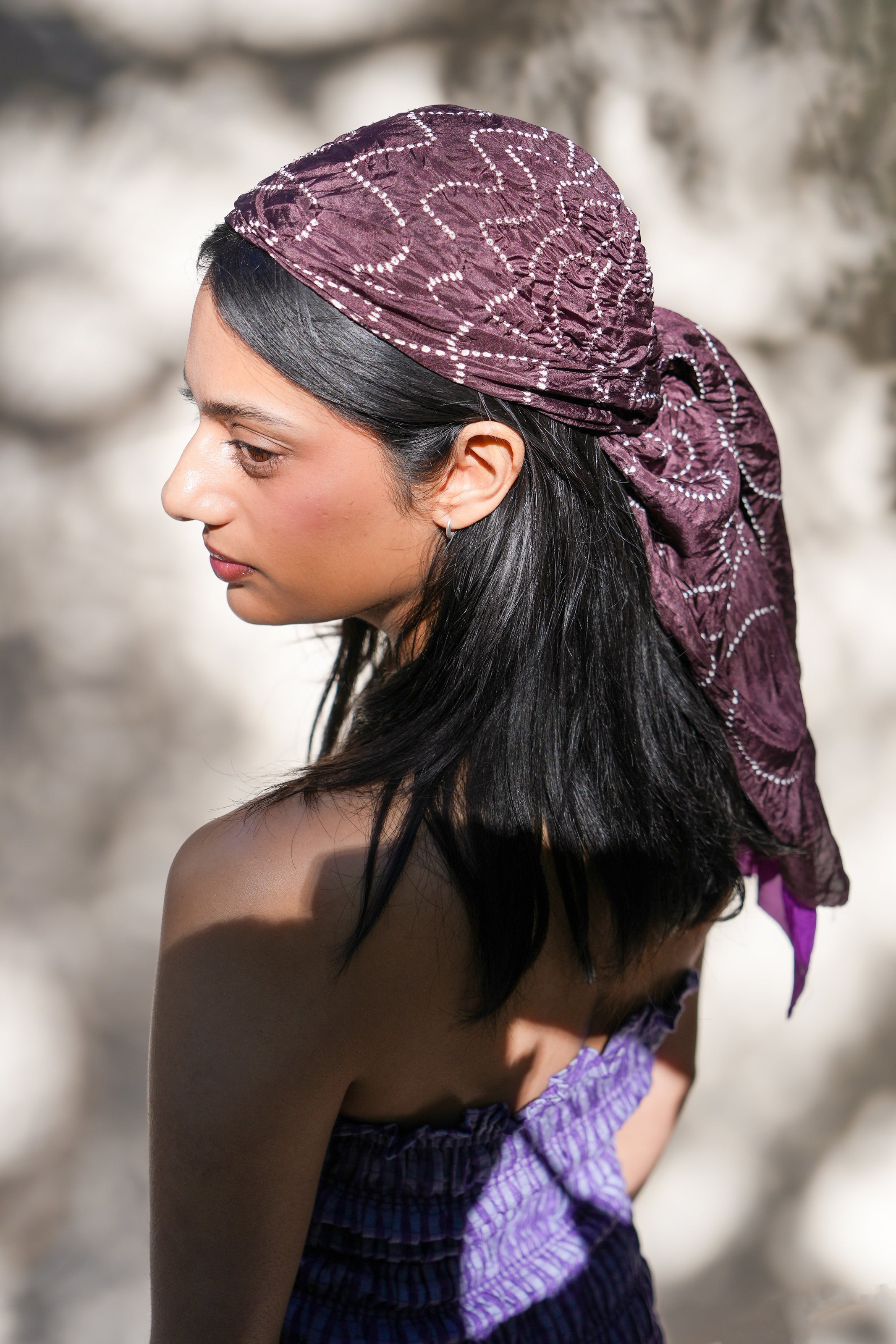 Intricate hand-dyed Bandhini dyeing by master artisan Adilji in Kutchh transforms this 100% silk sarong into a unique, luxurious wrap. Both colorways are designed to show off this beautiful technique, and go along with the rest of our collection. There are so many ways to style it. Peep special butterfly motifs hidden within the geometric design.