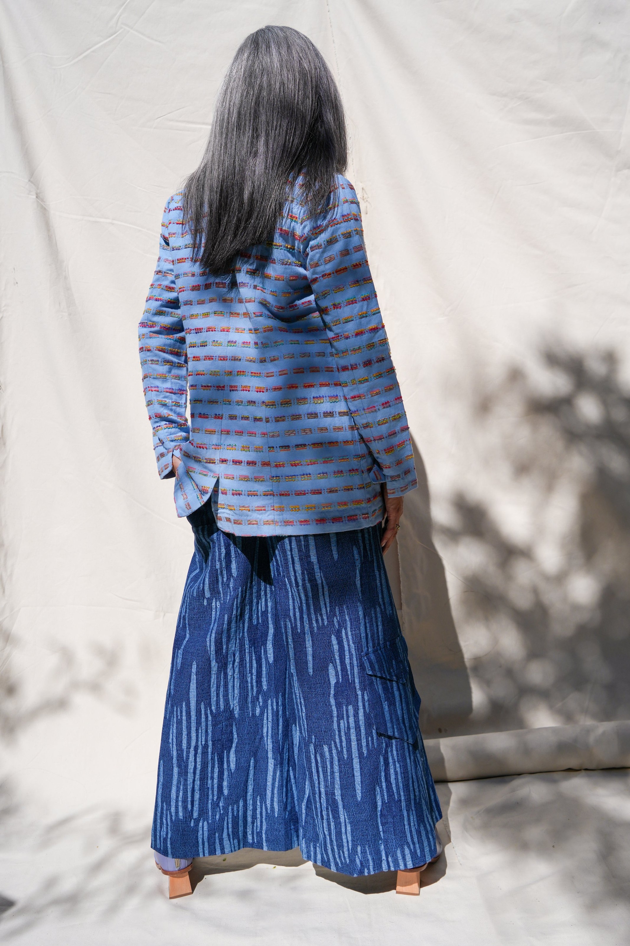 High-waisted, super wide leg pants made with an indigo-dyed cotton jacquard. A subtle colorblocked design plays with the front and back of our custom-woven fabric. Front and back pockets and a 3D cargo pocket with button closure at the leg. This style is definitely one we’ll be keeping and using in our wardrobes for years to come. It pairs will with any of your fave blouses, almost like an abacaxi version of denim or chambray jeans.