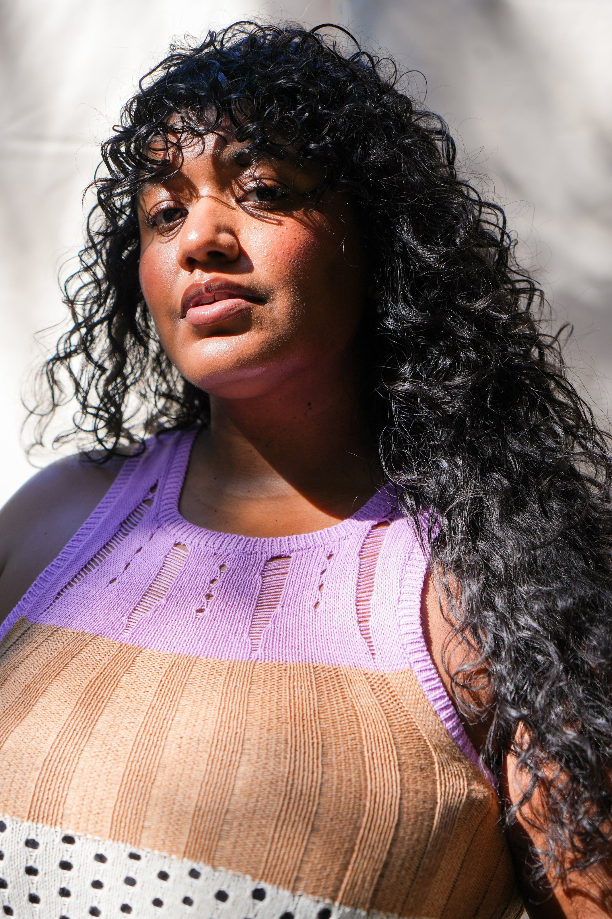 A long, fitted racerback dress knit with native tangüis cotton in Peru. Our intricate openwork design features stripes of several different knitting techniques. High side slit on one side. This dress is super comfortable and unlike any other.