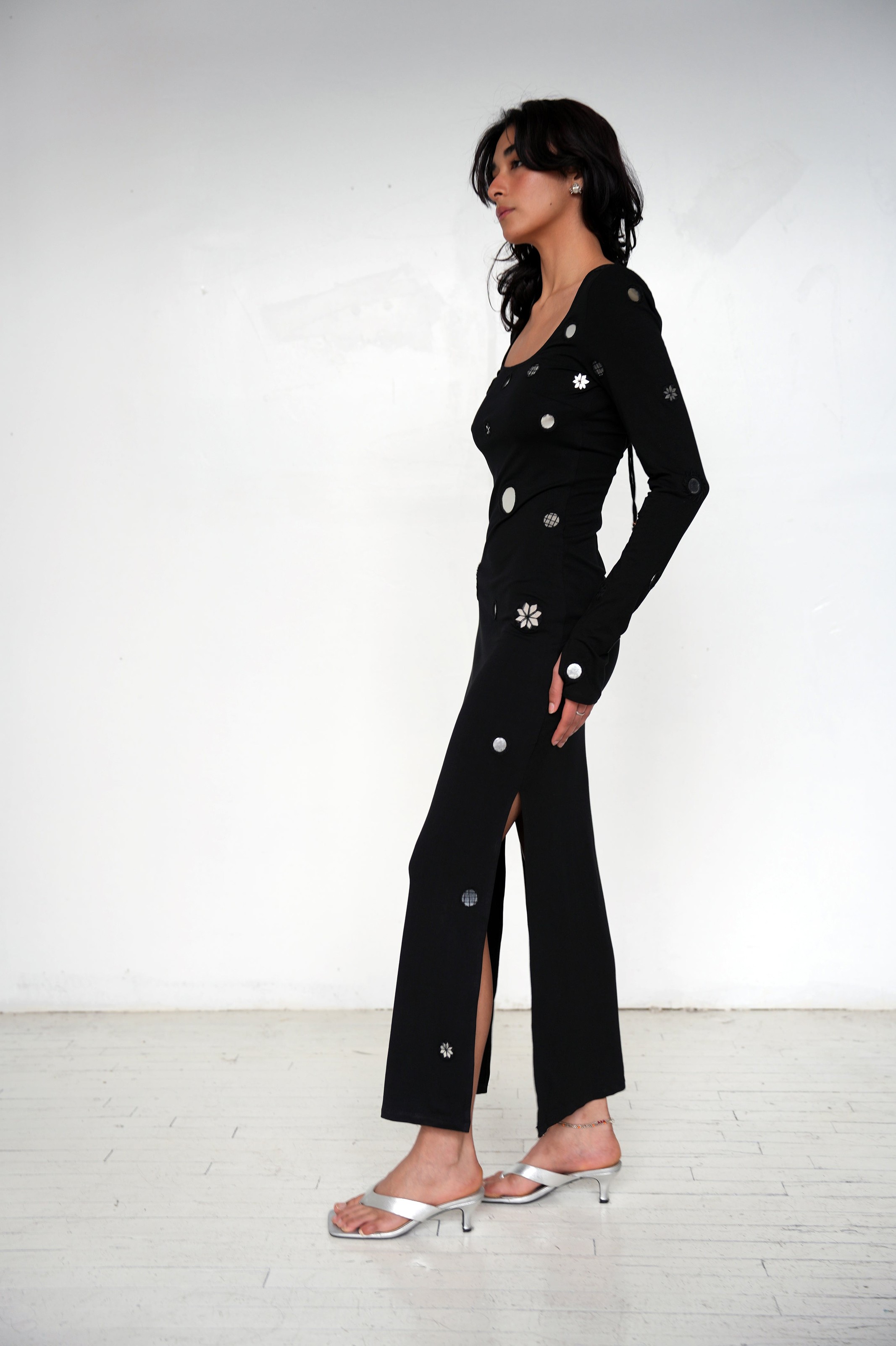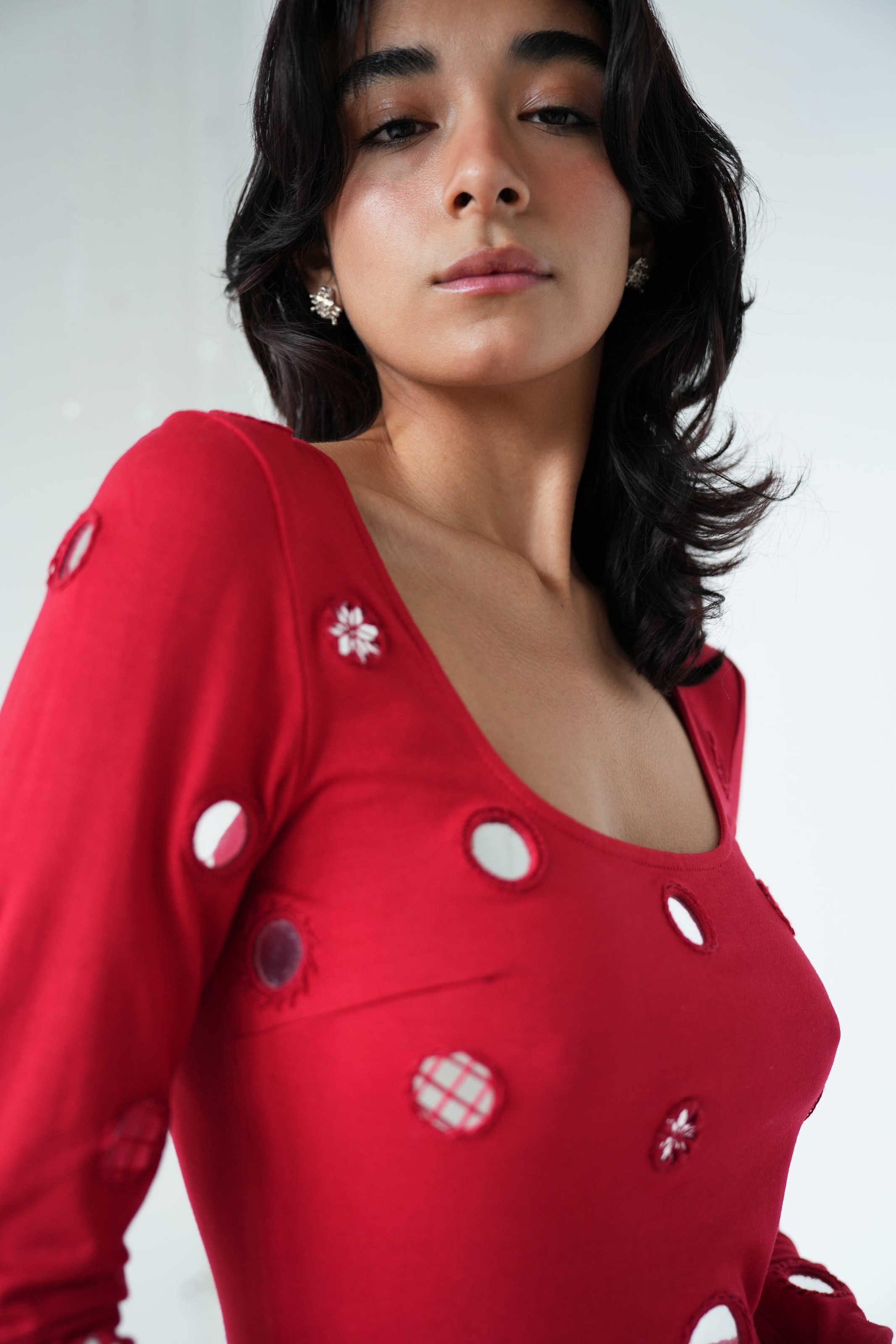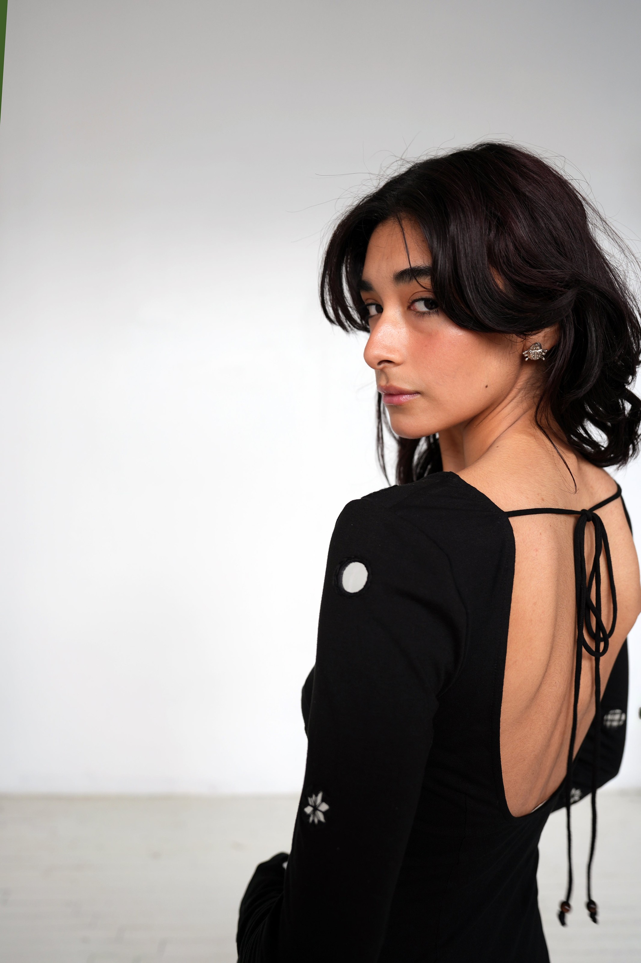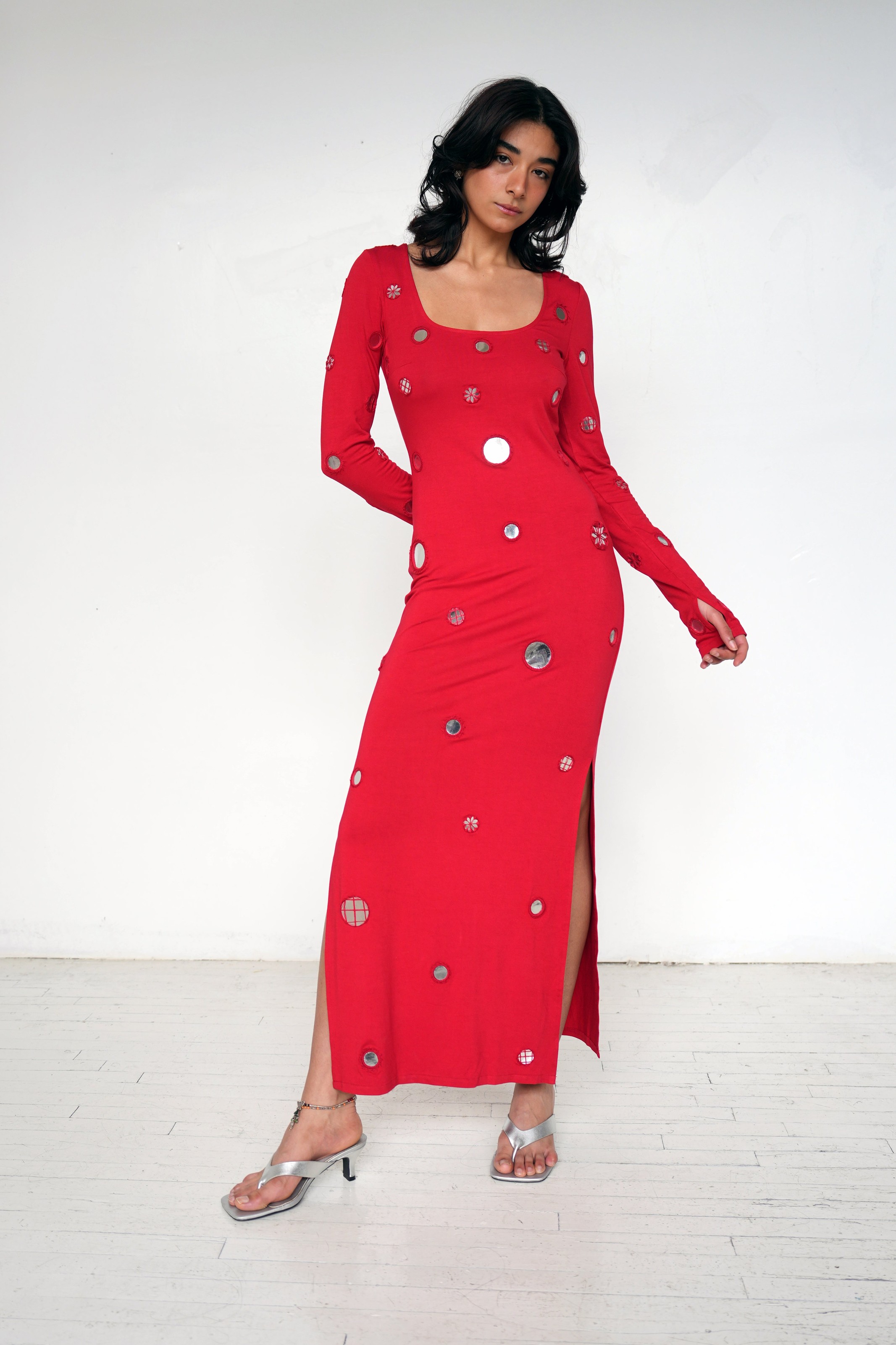 The Tara dress is named after a true star and became one of our best-selling designs in 2022. Now we brought it back in black and cherry red jersey with large shisha embellishment. Shisha means 'mirror' in Hindi, and the technique consists of mirror beads that are hand-embroidered into the fabric.