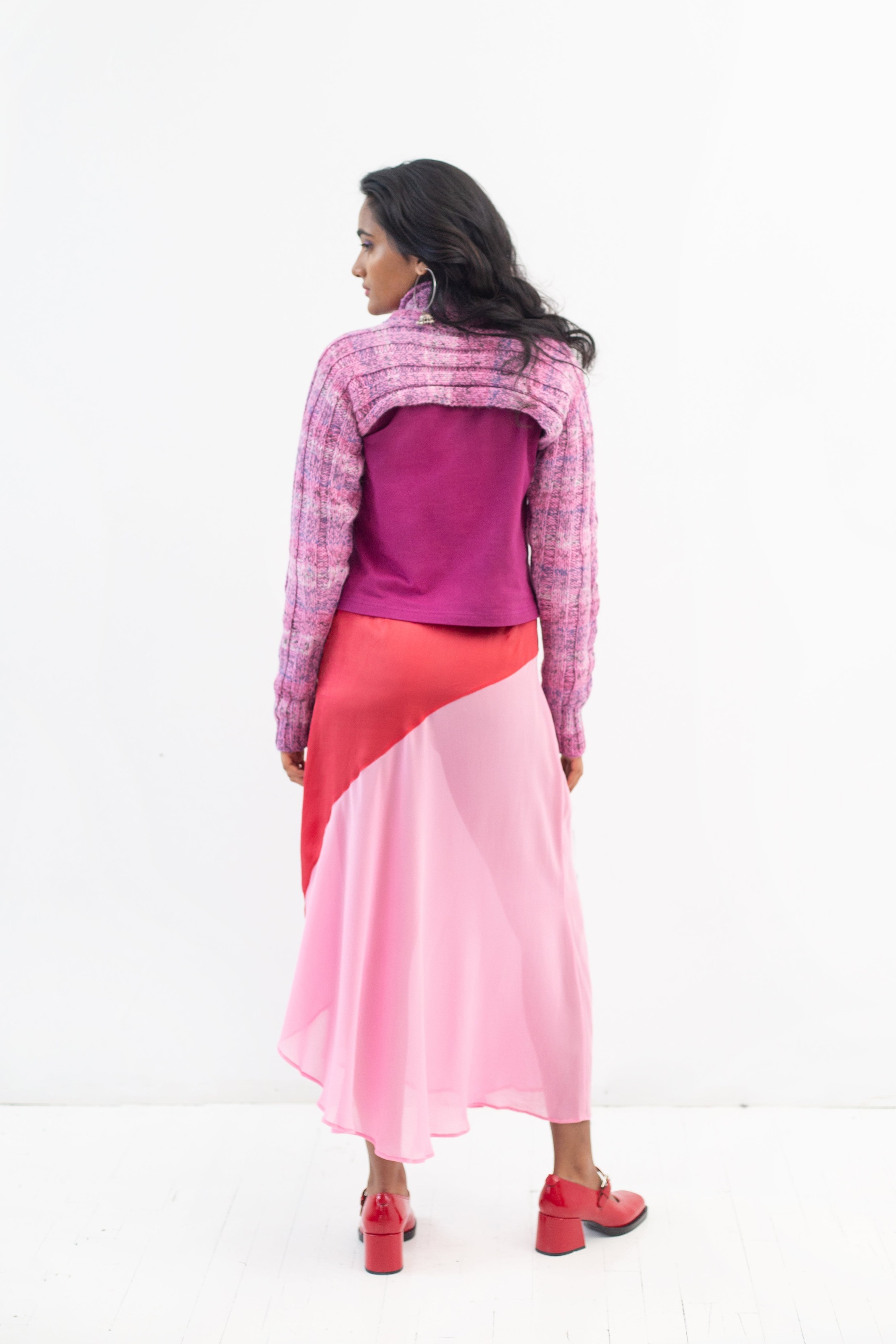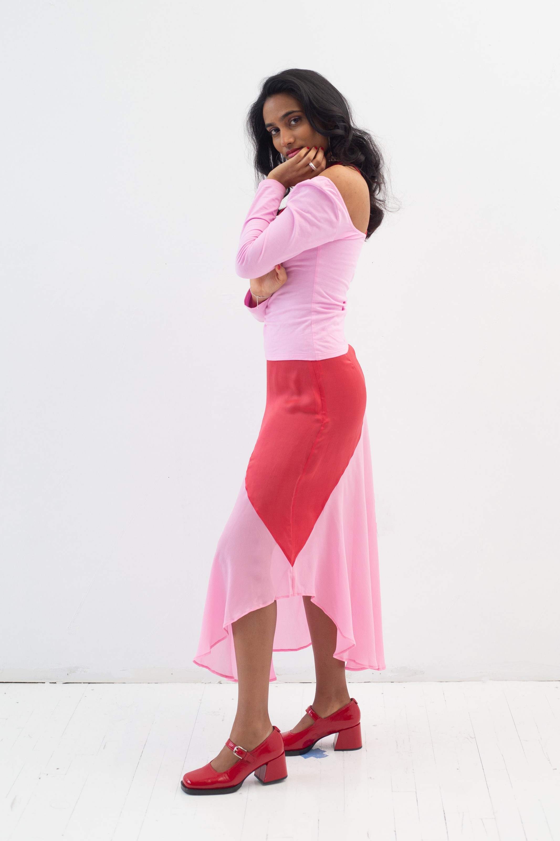 Bias-cut silk slip skirt with a play on colorblocking, texture, and sheerness, with a mix of 100% silk crepe and chiffon. Wear it with our pink baby alpaca Balaclava Pullover.